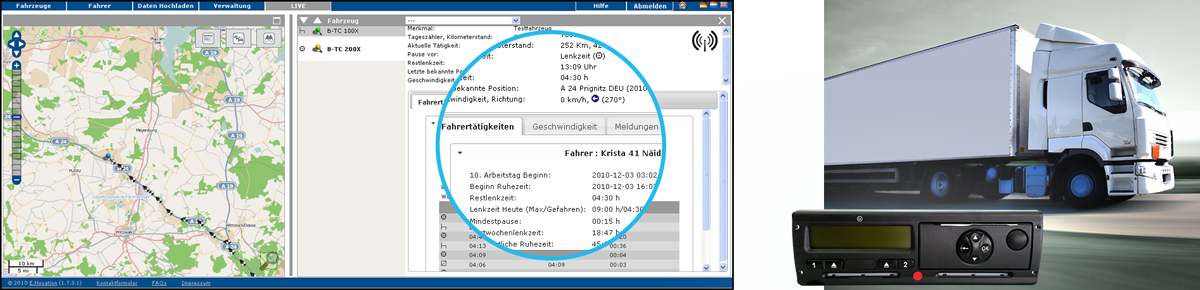 Dem Disponenten werden damit zu jeder Zeit die aktuellen Lenk- und Ruhezeiten und das verbleibende Lenkzeitbudget seiner Fahrer angezeigt. Somit weiß er, wie lange seine Fahrer noch fahren dürfen und wird zudem frühzeitig auf eventuell eintretende Verstöße hingewiesen. Alle Daten werden gesetzeskonform 24 Monaten im Hochsicherheitsrechenzentrum (ISO 27001) gespeichert und auf einer geographischen Karte angezeigt.